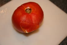Heat a pan of water to a roiling boil. Be sure to leave enough room to add your tomatoes without overflowing. Drop the tomato in for approximately 30 seconds.