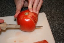 Just to the side of the stem, or core, use the knife to cut a petal, following the curve of the tomato. Beefsteak tomatoes, such as the one pictured have fairly thin walls and lots of seeds.