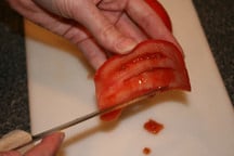 For delicate dishes follow the technique for peeling and coring the tomatoes. Then, cut the tomatoes in half along the equator and scoop the seeds out of the cavities.