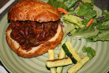 This little number is easy on both the wallet and your waistline; it is also surprisingly filling.  I served it on onion rolls, but hamburger buns will do.