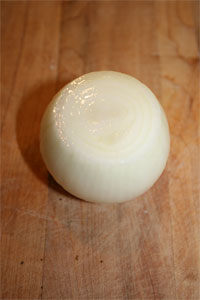 Remove the papery skin and slice just enough off the root end for the onion to sit flat on a cutting board.
