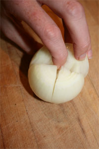 Carefully make two cuts, dividing the onion into quarters part way through the onion. Do not cut all the way through the bottom.