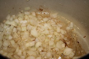 Place your bacon slices in a heavy pot and turn the heat to medium. While the bacon is cooking dice the onions. Remove the bacon from the pan when it is done cooking, but before it is crisp. It’s important not to overcook the bacon as it will create a burnt flavor in the grease. There will be browned bits of bacon stuck to the bottom of the pan, this is just fine and will loosen when liquids are added.