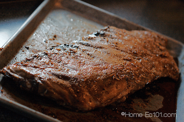 Preheat the oven to 225F. Cook uncovered for 2 hours, wrap in foil, and cook for an additional hour or until tender. I turn the slab of ribs once every hour, but I’m not sure it’s necessary.