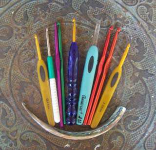 Pretty much the same thing goes for hooks.  Either start off with one or have a collection of three–G (4.5 mm), H (5 mm) and I (5.5 mm) on hand.