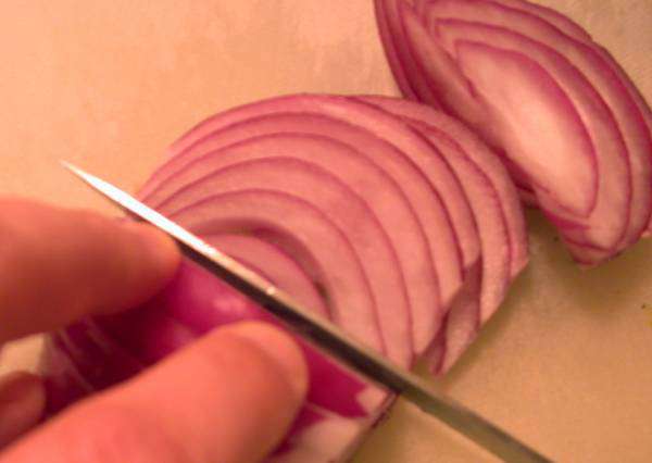 Slice the red onion into strips from root end to the top, rather than cutting into rings. This gives nice sturdy pieces that work well in this chunky salad.