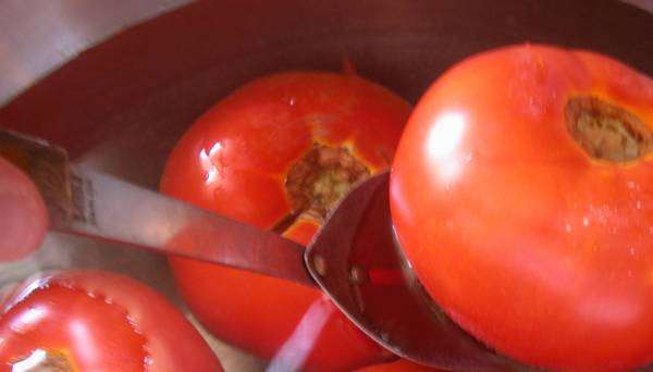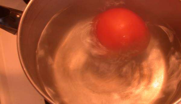 Using a slotted spoon, quickly remove the tomatoes to the cold water bath and leave them for at least a few minutes – until you can handle them, or until they’re cold if you’d rather.