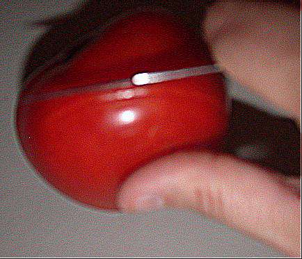 You’ll want a paring knife for this – do not use a serrated knife, just a nice, sharp paring knife. With the (already washed) tomato in your non-knife-holding hand, scrape the sharp edge of the knife blade over the entire tomato, while holding the knife blade perpendicular to the surface.
