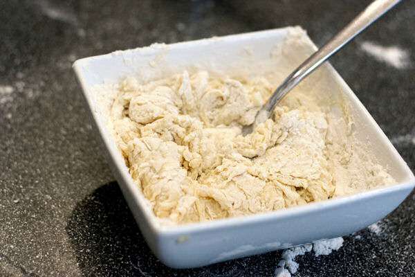 • Stir together 1 1/2 cups of flour, salt, pepper, and baking powder. In another dish mix the egg and milk. Add the liquid to the flour and stir until a workable dough forms. (You can experiment with more or less flour or milk until you find the exact consistency you want)