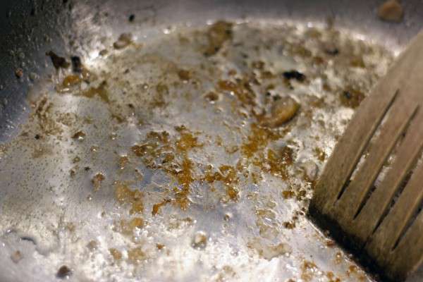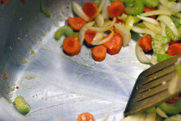 • Add all of the vegetables, except the garlic to the pot. Add the wine and stir with a wooden spoon or spatula to scrape up all those browned bits.