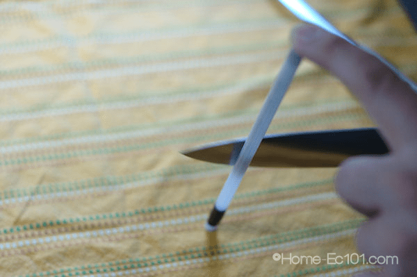 The last step is to use the steel. This steel rod is included with many knife blocks or can be purchased separately. It does not remove metal like the previous two steps, it simply reshapes the edge, removing the burr from the edge of the blade.